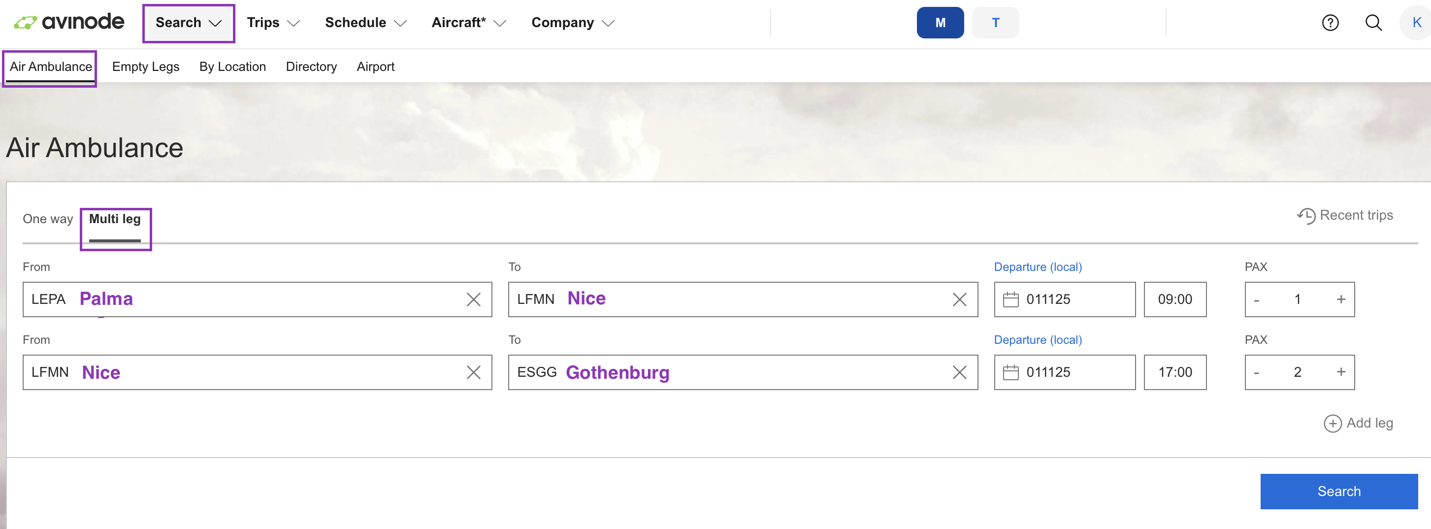 The next step would be to go to Search → Air Ambulance and search for a Multi-leg trip (a flight with multiple stops). Combining the trips together, we would fly Palma → Nice → Gothenburg.