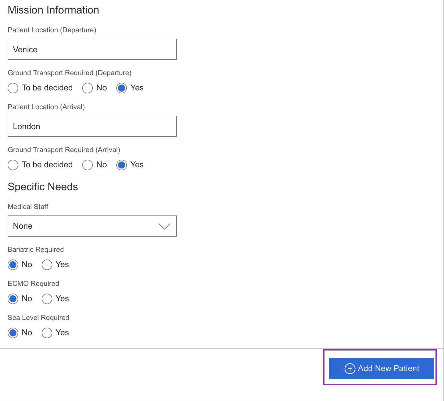 In the search result page, select a few providers just as you would normally do. Fill out the Patient Request Form for Patient 1 (Venice → London). Then click Add New Patient to create an additional Patient Request Form for Patient 2 Salzburg → Belgium). Once everything is completed, send the request.
