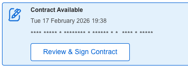 Select a trip with status "Contract Available" on Home or in Trips Buying (the contract can also be viewed in the message related to the trip). Now you can open the contract by pressing "Review & Sign Contract" to review all terms. You will see Aircraft, Trip Details, T&Cs, and cancellation policy clearly separated.