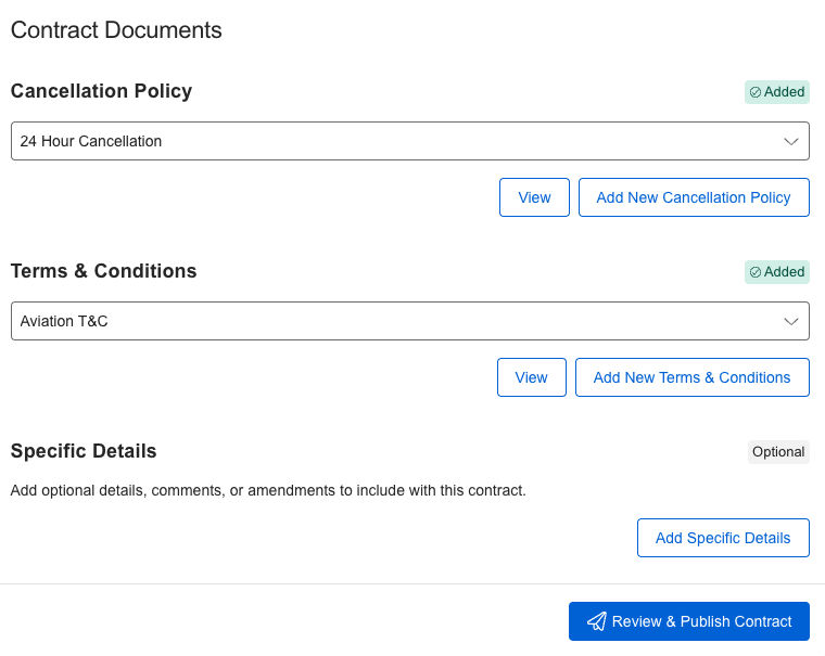 Fill in the required fields (cancellation policy, terms & conditions). Avinode uses these structured inputs rather than PDF uploads because T&Cs and cancellation policies must be separate for compliance and clean data. These T&Cs and Cancellation policies will be saved for future contracts. As an option, you can add Specific details, comments, or amendments. Once done, press "Review and Publish".