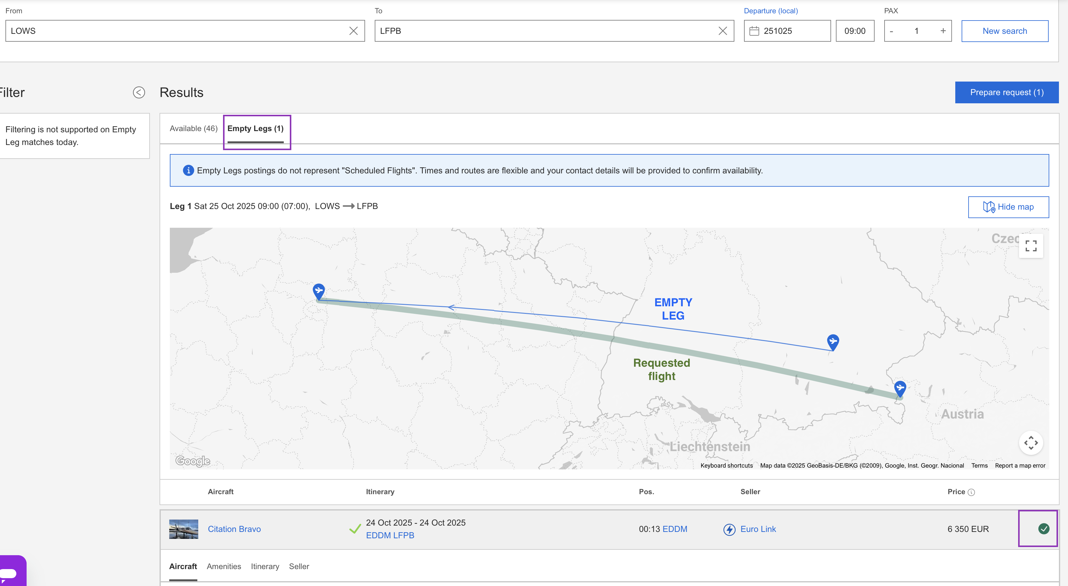 In this example, we searched for a flight from LOWS (Salzburg) to LFPB (Paris) on the 25th (indicated by the green line on the map). The search algorithm identified one possible empty leg, from Munich to Paris on the 24th, indicated by the blue line on the map. Although it isn't an exact match for the date or departure location, this is often not an issue because operators can be flexible with routes and sometimes dates. Go ahead and select the checkmark to add it to the flights you would like to request.
