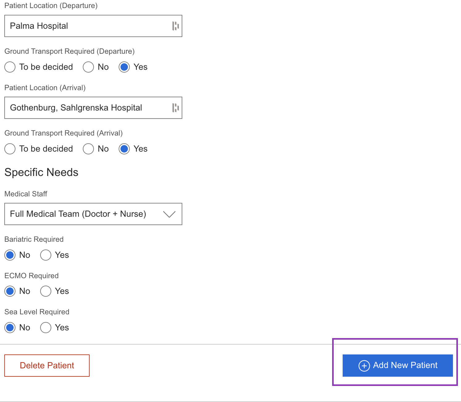 In the search result page, select a few providers just as you would normally do. Fill out the Patient Request Form for Patient 1 (Palma → Gothenburg). Then click Add New Patient to create an additional Patient Request Form for Patient 2 (Nice → Gothenburg). Once everything is completed, send the request.