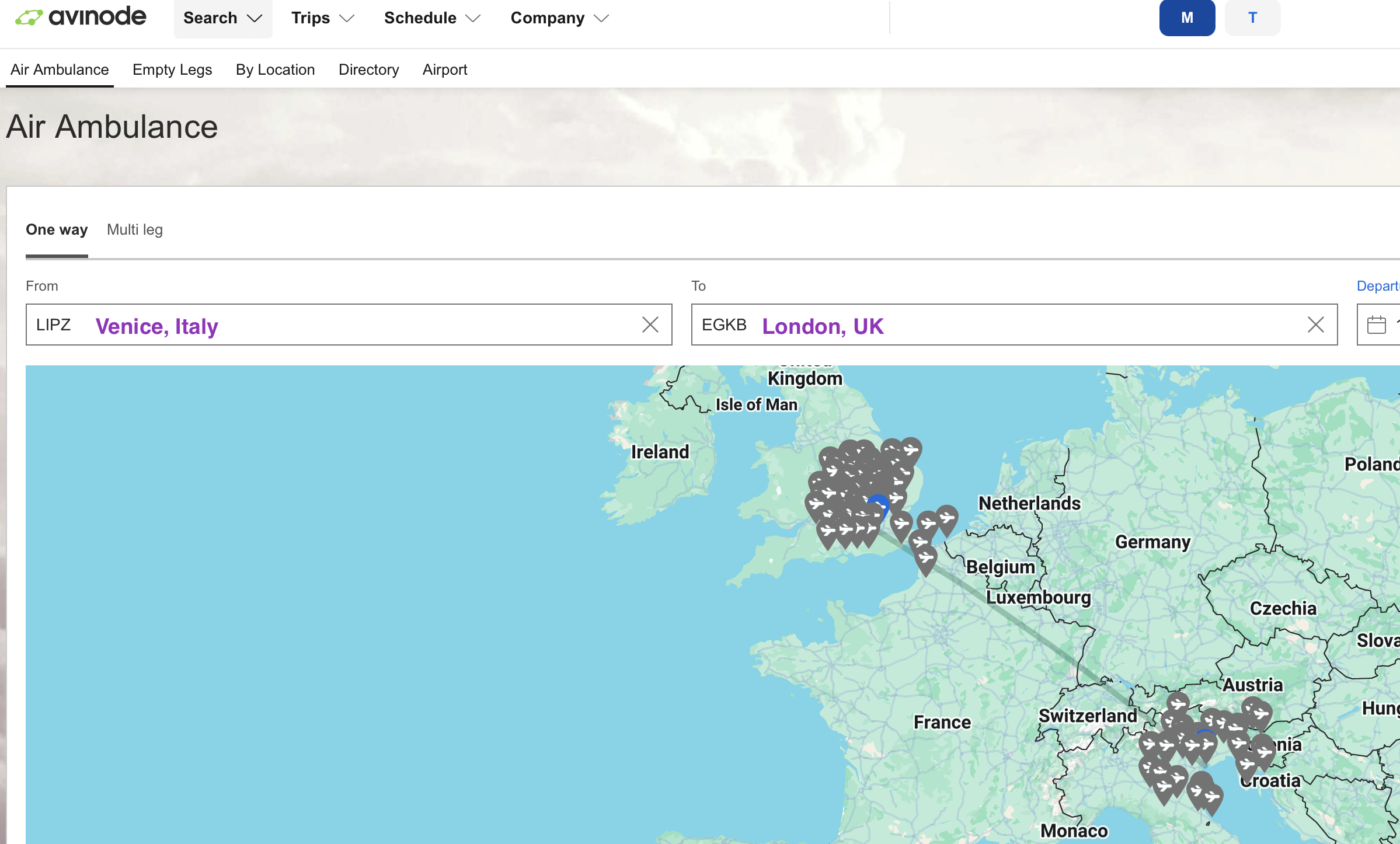Multi-leg – Used when the flight includes multiple stops, such as picking up or dropping off patients along the route. Example: Start in Palma de Mallorca (LEPA), stop in Barcelona (LEBL) to pick up another patient, and continue to the final destination in London (EGKB).