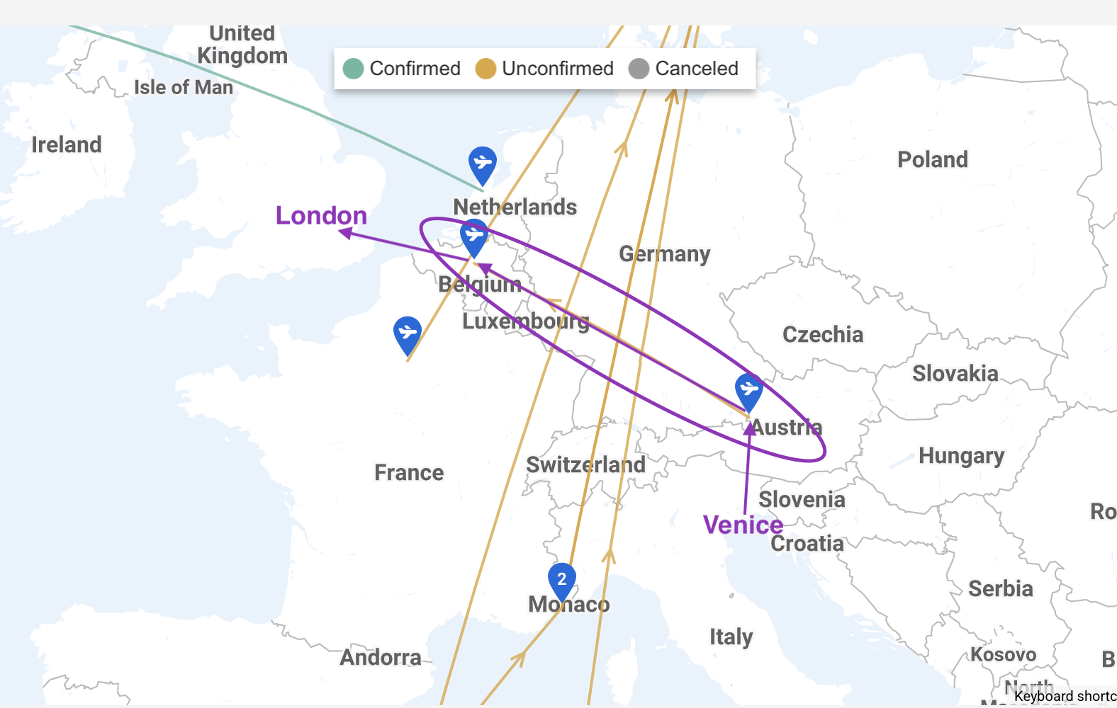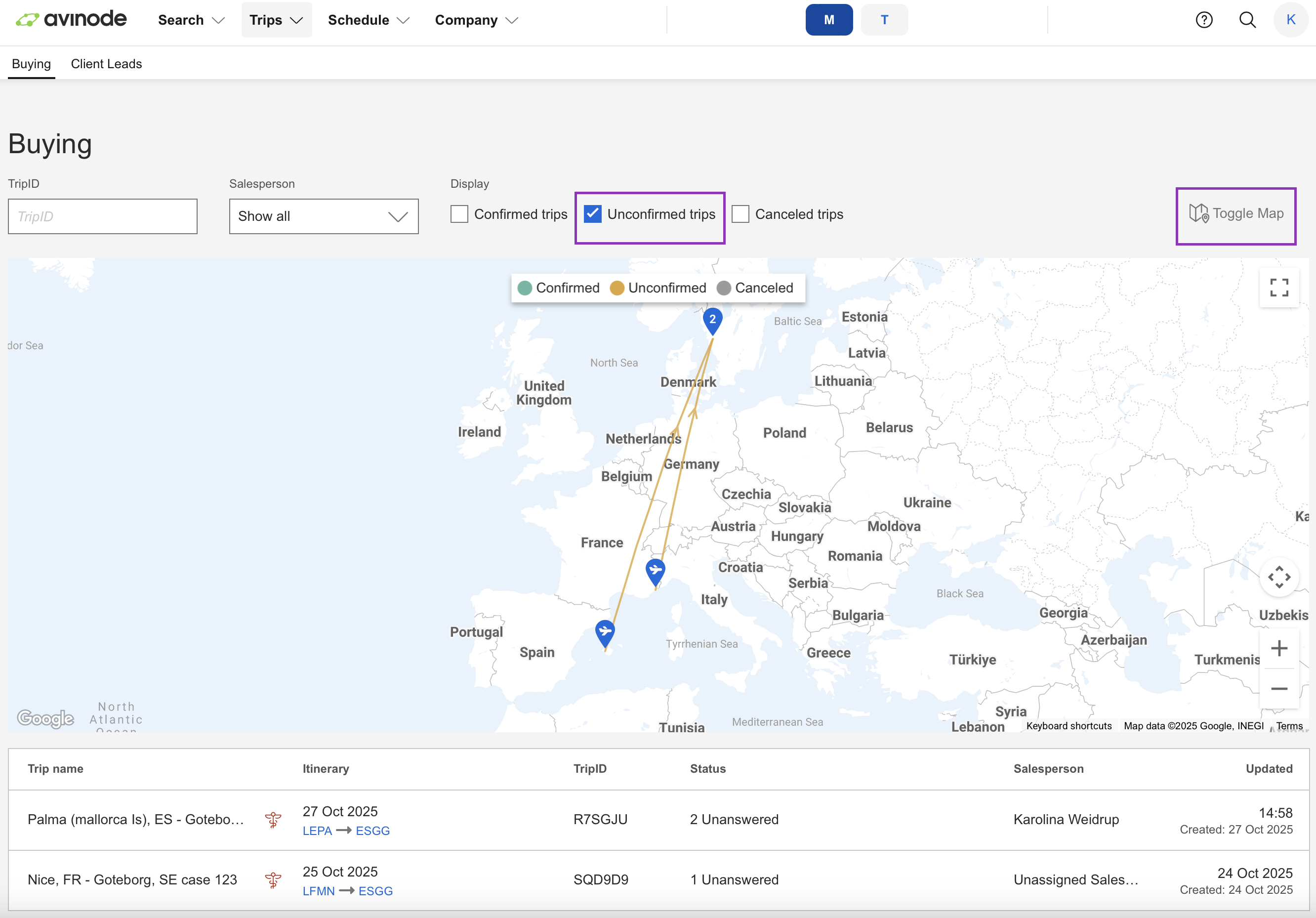 In this example, we can see that we have one trip Palma de Mallorca→Gothenburg, Sweden, and a second trip from Nice, France →Gothenburg, Sweden. As we can see from the map, the trips are very similar to each other, and there's a possibility of combining them into one trip instead of two.