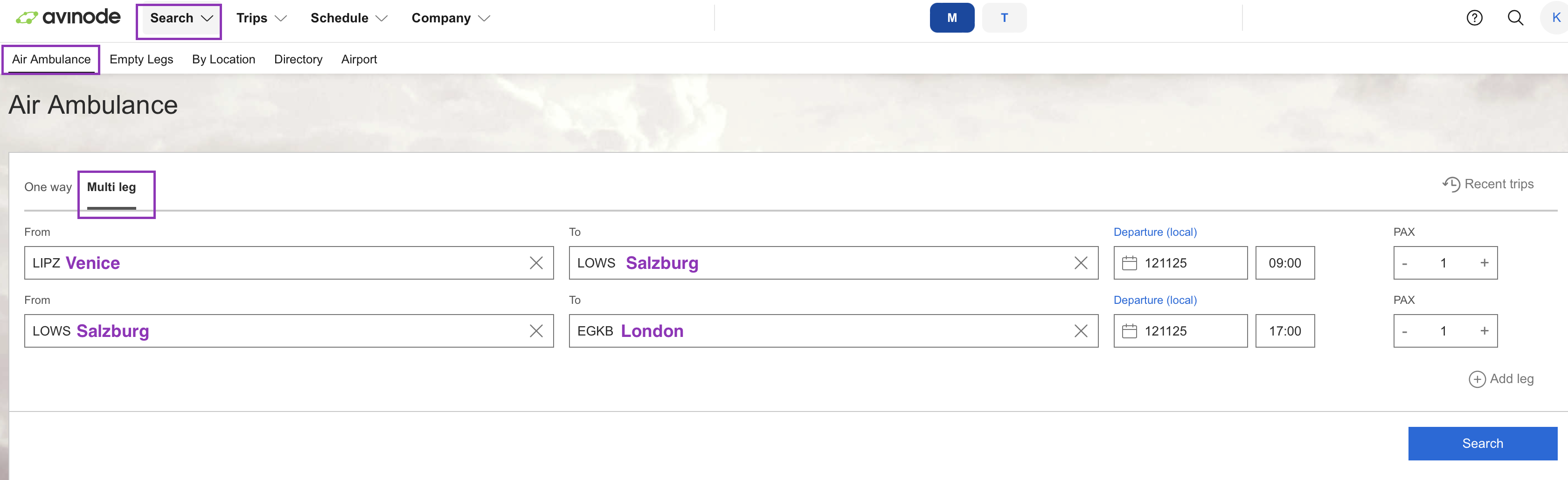 Air ambulance operators can list their available empty legs on Avinode. These are visible and can be requested by you in two different locations within the system.