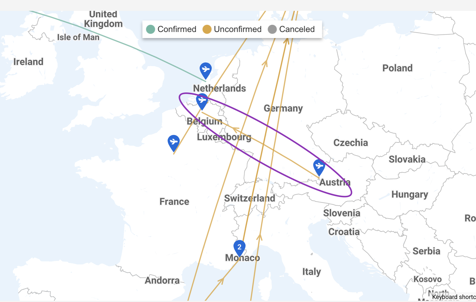 Looking at our existing cases on the pooling map, we can spot a pooling opportunity with the trip between Salzburg, Austria and Brussels, Belgium: